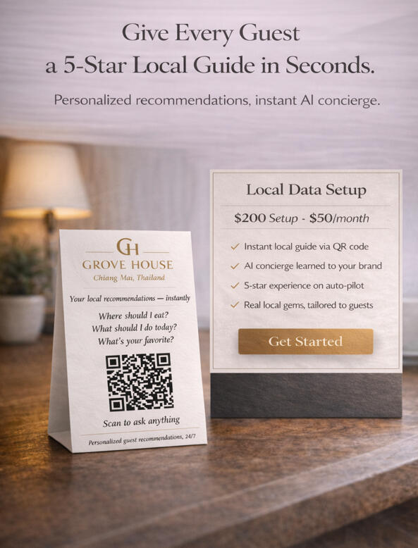 Guests scan a QR code and get answers that feel like they came directly from you — where to eat, what to do, what to avoid — without messaging you or your staff.So instead of repeating the same questions every day, your guests get instant, personalized help anytime during their stay.Your tone. Your recommendations. Running 24/7.